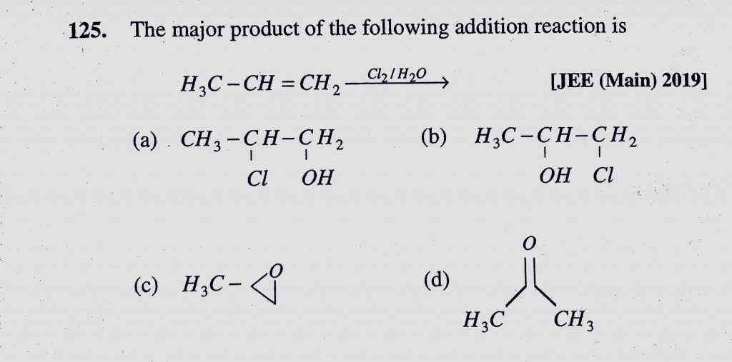 The major product of the following addition reactions H3C – CH = CH2 Cl2/H2O The major product of the following addition reactions H3C - CH = CH2 Cl2/H2O December 16, 2020 Category: Uncategorised (JEE Advanced Physics by BM Sharma + GMP Solutions) , Facebook Messenger WhatsApp Share this:TwitterFacebook Related