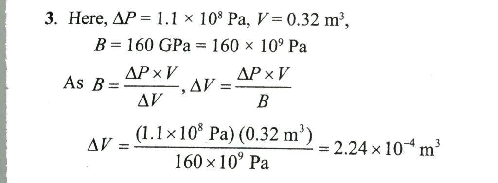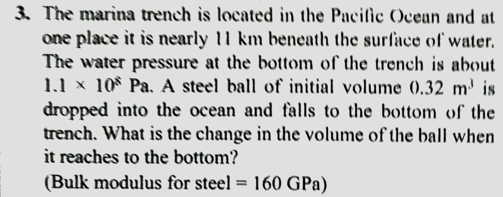 The marina Trench is located in the pacific ocean, and at one place it is nearly eleven km beneath the surface of water. The water pressure at the bottom of the Trench is about 1.1× 10^8 Pa. A steel ball of initial volume 0.32 m^3 is dropped into the ocean and falls to the bottom of the Trench. what is the change in the volume of the ball when it reaches to the bottom?