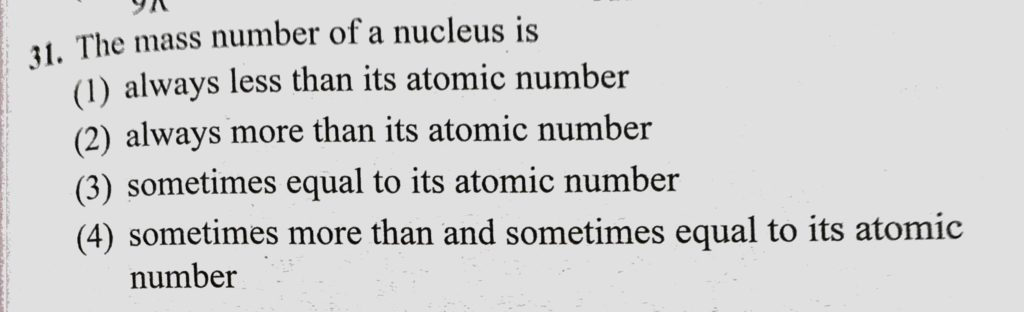 The mass number of a nucleus is (1) always less than its atomic number (2) always more than its atomic number (3) sometimes equal to its atomic number The mass number of a nucleus is (1) always less than its atomic number (2) always more than its atomic number (3) sometimes equal to its atomic number October 16, 2020 Category: Uncategorised (JEE Advanced Physics by BM Sharma + GMP Solutions) , Facebook Messenger WhatsApp Share this:TwitterFacebook Related