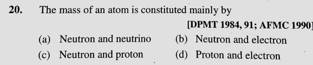 The mass of an atom is continuted mainly by (a) Neutron and neutrino (b) Neutron and electron (c) Neutron and proton (d) proton and electron The mass of an atom is continuted mainly by (a) Neutron and neutrino (b) Neutron and electron (c) Neutron and proton (d) proton and electron November 26, 2020 Category: Uncategorised (JEE Advanced Physics by BM Sharma + GMP Solutions) , Facebook Messenger WhatsApp Share this:TwitterFacebook Related