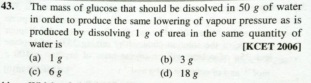 The mass of glucose that should be dissolved in 50 g of water on water in order to produce the same lowering pof vapour pressure as is produced by dissolving 1 g of urea in the same quantity of water is At 80∘ C the amount of A in the mixture is : (1 atm=760 mm Hg) the vapour pressure of pure liquid A is 520 mm Hg and that of pure liquid B is 1000 mm Hg. If a mixture solution of A and B boils at 80∘ C and 1 atm pressure December 12, 2020 Category: Uncategorised (JEE Advanced Physics by BM Sharma + GMP Solutions) , Facebook Messenger WhatsApp Share this:TwitterFacebook Related