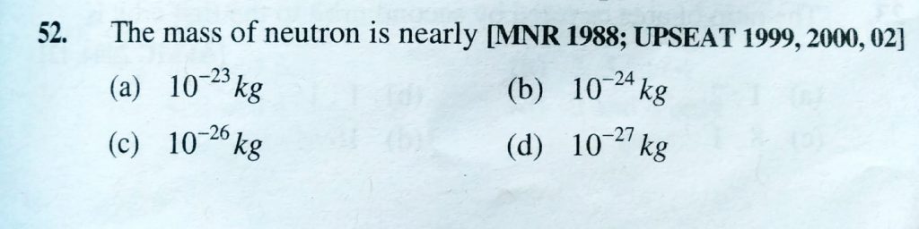 The mass of neutron is nearly (a) 10 ^-23 kg (b) 10^-24 kg (c) 10^-26 kg (d) 10^-27 kg The mass of neutron is nearly (a) 10 ^-23 kg (b) 10^-24 kg (c) 10^-26 kg (d) 10^-27 kg November 26, 2020 Category: Uncategorised (JEE Advanced Physics by BM Sharma + GMP Solutions) , Facebook Messenger WhatsApp Share this:TwitterFacebook Related