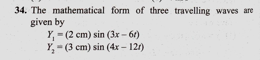 The mathematical form of three travelling waves are given by Y1 = (2 cm) sin (3x – 6t) Y2 = (3 cm) sin (4x – 12t) And Y3 = (4 cm) sin (5x – 11t) of these waves, (1) Wave 1 has greatest wave speed and greatest maximum (1) Wave 1 has greatest wave speed and greatest maximum The mathematical form of three travelling waves are given by Y1 = (2 cm) sin (3x - 6t) Y2 = (3 cm) sin (4x - 12t) And Y3 = (4 cm) sin (5x - 11t) of these waves November 1, 2020 Category: Uncategorised (JEE Advanced Physics by BM Sharma + GMP Solutions) , Facebook Messenger WhatsApp Share this:TwitterFacebook Related
