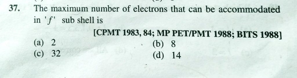 THe maximum number of electrons that can be accommodated in ‘f’ sub shell is (a) 2 (b) 8 (c) 32 (d) 14 THe maximum number of electrons that can be accommodated in 'f' sub shell is (a) 2 (b) 8 (c) 32 (d) 14 November 28, 2020 Category: Uncategorised (JEE Advanced Physics by BM Sharma + GMP Solutions) , Facebook Messenger WhatsApp Share this:TwitterFacebook Related