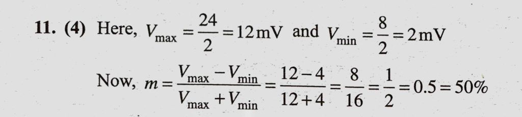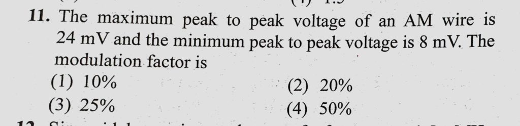 The maximum peak to peak voltage of an AM wire is 24 mV and the minimum peak to peak voltage is 8 mV. The modulation factor is The maximum peak to peak voltage of an AM wire is 24 mV and the minimum peak to peak voltage is 8 mV. The modulation factor is October 22, 2020 Category: Uncategorised (JEE Advanced Physics by BM Sharma + GMP Solutions) , Facebook Messenger WhatsApp Share this:TwitterFacebook Related