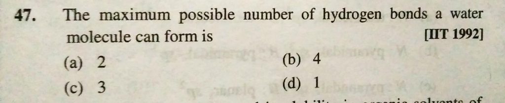 The maximum possible number of hydrogen bonds a water molecule can form is The maximum possible number of hydrogen bonds a water molecule can form is December 9, 2020 Category: Uncategorised (JEE Advanced Physics by BM Sharma + GMP Solutions) , Facebook Messenger WhatsApp Share this:TwitterFacebook Related