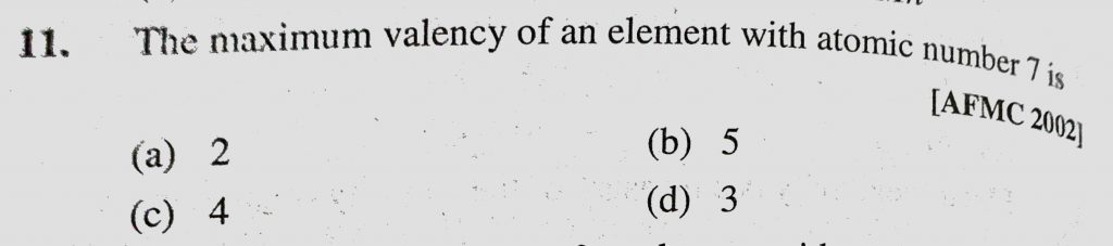 The maximum valency of an element with atomic number 7 is (a) 2 (b) 5 (c) 4 (d) 3 The maximum valency of an element with atomic number 7 is (a) 2 (b) 5 (c) 4 (d) 3 November 10, 2020 Category: Uncategorised (JEE Advanced Physics by BM Sharma + GMP Solutions) , Facebook Messenger WhatsApp Share this:TwitterFacebook Related