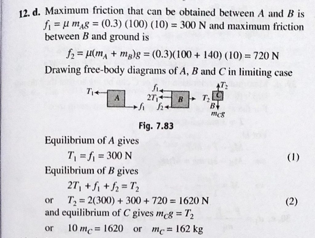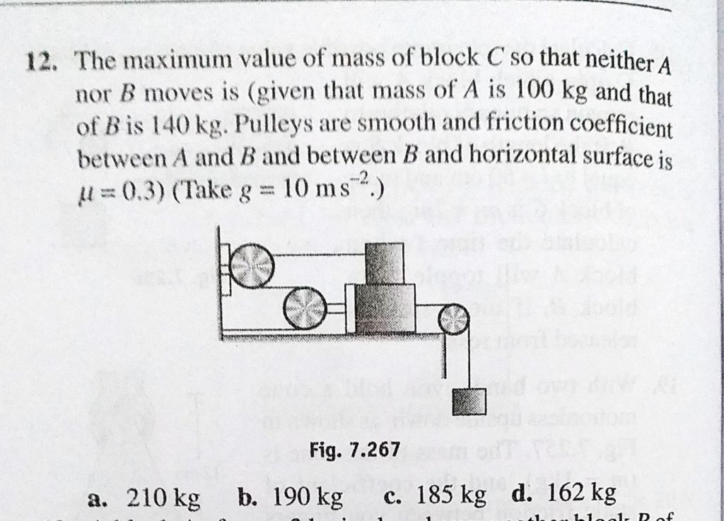 The maximum value of mass of block C so that neither A nor B moves is ( given that mass of A is 100 kg and that of B is 140 kg. Pulleys are smooth and friction coefficient between A and B and between B A horizontal force just sufficient to move a body of mass 4 kg lying on a rough horizontal surface is applied on it. The coefficient of static and kinetic friction between the body and the surface October 1, 2020 Category: Uncategorised (JEE Advanced Physics by BM Sharma + GMP Solutions) , Facebook Messenger WhatsApp Share this:TwitterFacebook Related