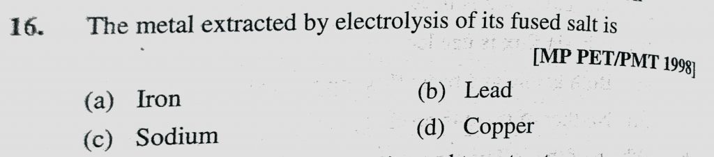 The metal extracted by electrolysis of its fused salt is (a) Iron (b) Lead (c) Sodium (d) Copper The metal extracted by electrolysis of its fused salt is (a) Iron (b) Lead (c) Sodium (d) Copper November 12, 2020 Category: Uncategorised (JEE Advanced Physics by BM Sharma + GMP Solutions) , Facebook Messenger WhatsApp Share this:TwitterFacebook Related
