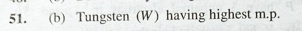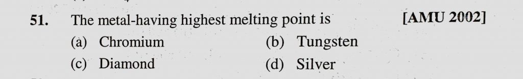 The metal – having highest melting point is (a) Chromium (b) Tungsten (c) Diamond (d) Silver The metal - having highest melting point is (a) Chromium (b) Tungsten (c) Diamond (d) Silver November 8, 2020 Category: Uncategorised (JEE Advanced Physics by BM Sharma + GMP Solutions) , Facebook Messenger WhatsApp Share this:TwitterFacebook Related