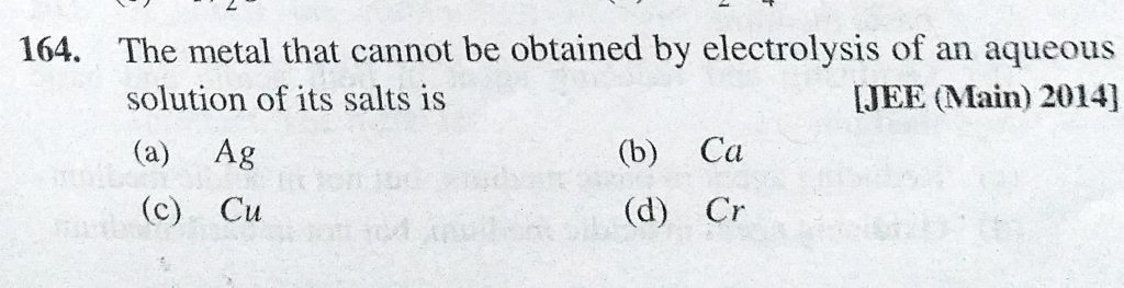 The metal that cannot be obtained by electrolysis of an aqueous solution of its salts is (a) Ag (b) Ca (c) Cu (d) Cr The metal that cannot be obtained by electrolysis of an aqueous solution of its salts is (a) Ag (b) Ca (c) Cu (d) Cr November 28, 2020 Category: Uncategorised (JEE Advanced Physics by BM Sharma + GMP Solutions) , Facebook Messenger WhatsApp Share this:TwitterFacebook Related