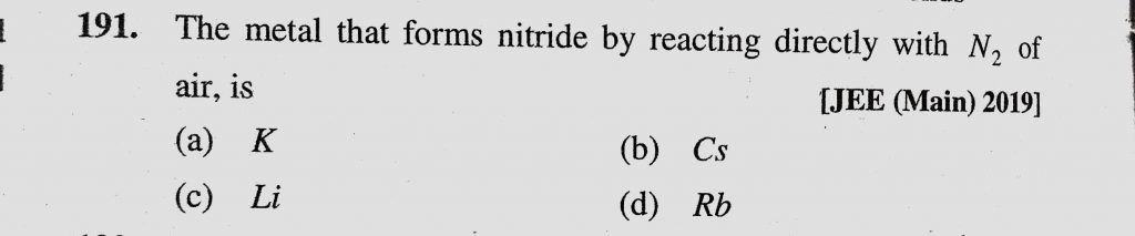The metal that forms nitride by reacting directly with N2 of air, is (a) K (b) Cs (c) Li (d) Rb is (a) K (b) Cs (c) Li (d) Rb The metal that forms nitride by reacting directly with N2 of air November 28, 2020 Category: Uncategorised (JEE Advanced Physics by BM Sharma + GMP Solutions) , Facebook Messenger WhatsApp Share this:TwitterFacebook Related