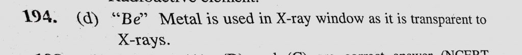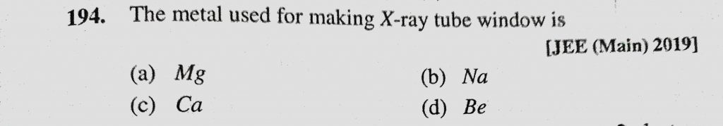 The metal used for making X-ray tube window is (a) Mg (b) Na (c) Ca (d) Be The metal used for making X-ray tube window is (a) Mg (b) Na (c) Ca (d) Be November 28, 2020 Category: Uncategorised (JEE Advanced Physics by BM Sharma + GMP Solutions) , Facebook Messenger WhatsApp Share this:TwitterFacebook Related