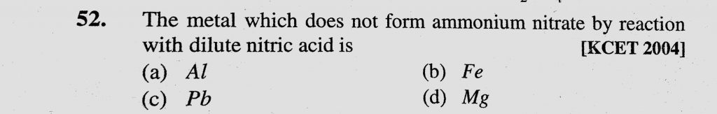 The metal which does not form ammonium nitrate by reaction with dilute nitric acid is (a) Al (b) Fe (c) Pb (d) Mg The metal which does not form ammonium nitrate by reaction with dilute nitric acid is (a) Al (b) Fe (c) Pb (d) Mg November 27, 2020 Category: Uncategorised (JEE Advanced Physics by BM Sharma + GMP Solutions) , Facebook Messenger WhatsApp Share this:TwitterFacebook Related