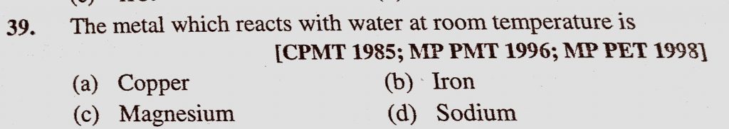 The metal which reacts with water at room temperature is (a) Copper (b) Iron (c) Magnesium (d) Sodium The metal which reacts with water at room temperature is (a) Copper (b) Iron (c) Magnesium (d) Sodium November 13, 2020 Category: Uncategorised (JEE Advanced Physics by BM Sharma + GMP Solutions) , Facebook Messenger WhatsApp Share this:TwitterFacebook Related