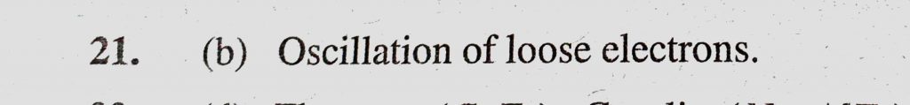 The metallic lustre exhibited by sodium is explained by (a) Diffusion of sodium ions (b) Oscillations of loose electrons (c) Excitation of free proton The metallic lustre exhibited by sodium is explained by (a) Diffusion of sodium ions (b) Oscillations of loose electrons (c) Excitation of free proton November 12, 2020 Category: Uncategorised (JEE Advanced Physics by BM Sharma + GMP Solutions) , Facebook Messenger WhatsApp Share this:TwitterFacebook Related