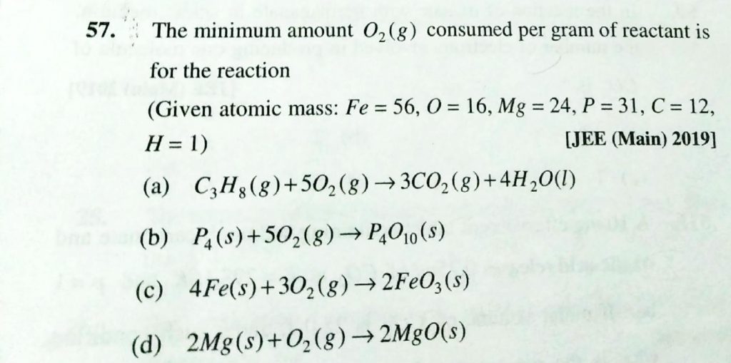 The minimum amount O2(g) consumed per gram of reactant is for the reaction (Given atomic mass :Fe = 56 , O = 16 , Mg = 24 , P = 31, C = 12, H = 1 ) C = 12 H = 1 ) Mg = 24 O = 16 P = 31 The minimum amount O2(g) consumed per gram of reactant is for the reaction (Given atomic mass :Fe = 56 November 25, 2020 Category: Uncategorised (JEE Advanced Physics by BM Sharma + GMP Solutions) , Facebook Messenger WhatsApp Share this:TwitterFacebook Related