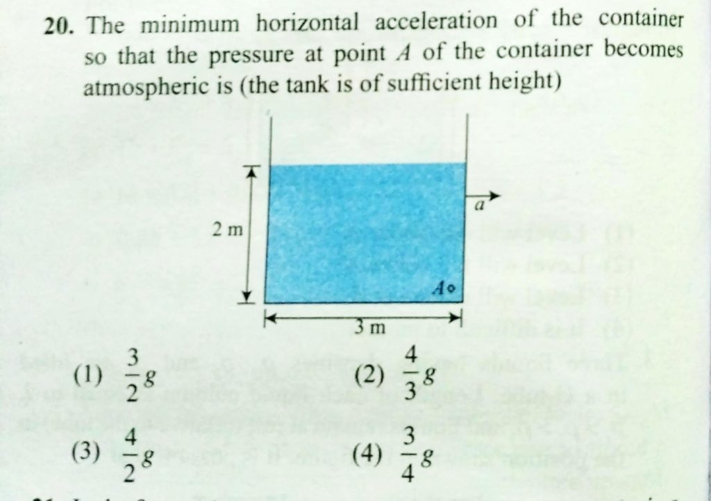 The minimum horizontal acceleration of the container a so that pressure at the point A of the container becomes atmospheric is (The tank is of sufficient height) The minimum horizontal acceleration of the container a so that pressure at the point A of the container becomes atmospheric is (The tank is of sufficient height) October 7, 2020 Category: Uncategorised (JEE Advanced Physics by BM Sharma + GMP Solutions) , Facebook Messenger WhatsApp Share this:TwitterFacebook Related