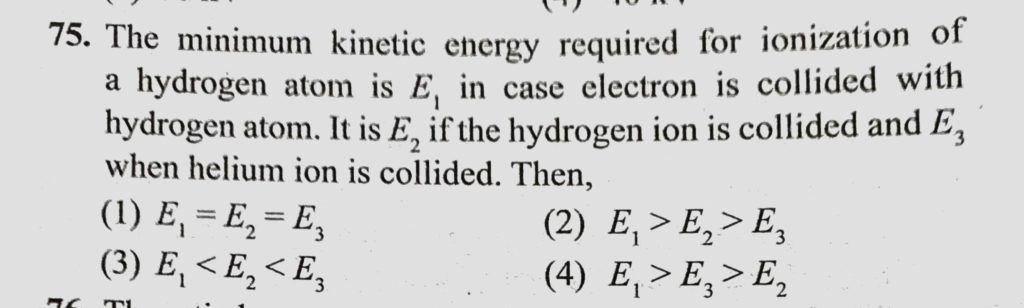 The minimum kinetic energy required for ionization of a hydrogen atom is E1 in case electron is collided with hydrogen atom. It is E2 if the hydrogen ion is collided and E3 when The minimum kinetic energy required for ionization of a hydrogen atom is E1 in case electron is collided with hydrogen atom. It is E2 if the hydrogen ion is collided and E3 when October 16, 2020 Category: Uncategorised (JEE Advanced Physics by BM Sharma + GMP Solutions) , Facebook Messenger WhatsApp Share this:TwitterFacebook Related