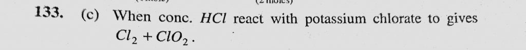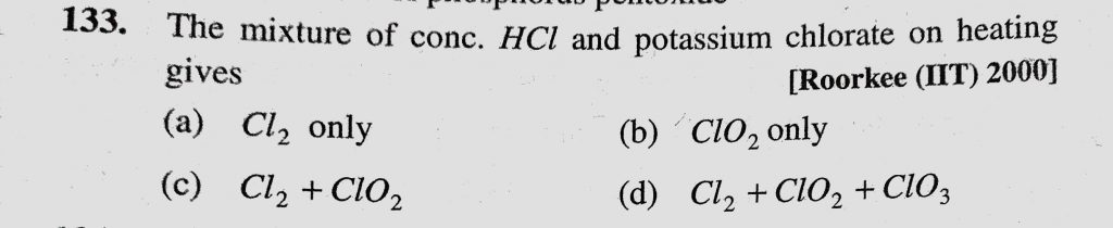 The mixture of conc. HCl and potassium chlorate on heating gives (a) Cl2 only (b) ClO2 only (c) Cl2 + ClO2 The mixture of conc. HCl and potassium chlorate on heating gives (a) Cl2 only (b) ClO2 only (c) Cl2 + ClO2 November 27, 2020 Category: Uncategorised (JEE Advanced Physics by BM Sharma + GMP Solutions) , Facebook Messenger WhatsApp Share this:TwitterFacebook Related