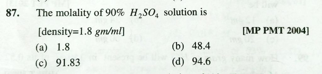 The molality of 90% H2SO4 solution is [ density = 1.8 gm/ml ] (a) 1.8 (b) 48.4 (c) 91.83 (d) 94.6 The molality of 90% H2SO4 solution is [ density = 1.8 gm/ml ] (a) 1.8 (b) 48.4 (c) 91.83 (d) 94.6 December 12, 2020 Category: Uncategorised (JEE Advanced Physics by BM Sharma + GMP Solutions) , Facebook Messenger WhatsApp Share this:TwitterFacebook Related