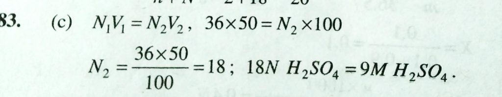 The molarity of a solution made by mixing 50 ml of conc. H2SO4 ( 36 N ) with 50 ml of water is (a0 36 M (b) 18 M (c) 9 M (d) 6 M The molarity of a solution made by mixing 50 ml of conc. H2SO4 ( 36 N ) with 50 ml of water is (a0 36 M (b) 18 M (c) 9 M (d) 6 M December 12, 2020 Category: Uncategorised (JEE Advanced Physics by BM Sharma + GMP Solutions) , Facebook Messenger WhatsApp Share this:TwitterFacebook Related