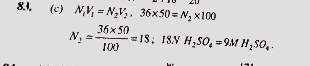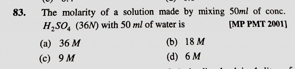 The molarity of a solution made by mixing 50 ml of conc. H2SO4 (36 N ) with 50 ml of water is The molarity of a solution made by mixing 50 ml of conc. H2SO4 (36 N ) with 50 ml of water is December 11, 2020 Category: Uncategorised (JEE Advanced Physics by BM Sharma + GMP Solutions) , Facebook Messenger WhatsApp Share this:TwitterFacebook Related