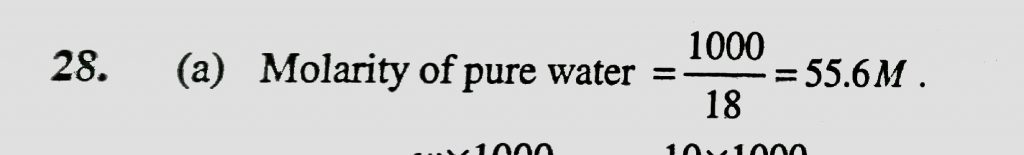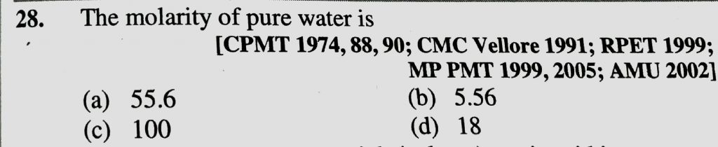 The molarity of pure water is (a) 55.6 (b) 5.56 (c) 100 (d) 18 The molarity of pure water is (a) 55.6 (b) 5.56 (c) 100 (d) 18 December 11, 2020 Category: Uncategorised (JEE Advanced Physics by BM Sharma + GMP Solutions) , Facebook Messenger WhatsApp Share this:TwitterFacebook Related