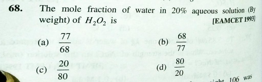 The mole fraction of water in 20% aqueous solution (By weight ) of H2O2 is The mole fraction of water in 20% aqueous solution (By weight ) of H2O2 is December 11, 2020 Category: Uncategorised (JEE Advanced Physics by BM Sharma + GMP Solutions) , Facebook Messenger WhatsApp Share this:TwitterFacebook Related