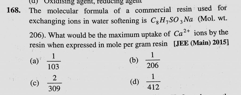 The molecular formula of a commercial resin used for exchanging ions in water softening is C8H7SO3Na (Mol. wt. 206). What would be the maximum uptake of Ca 2+ ions by the resin The molecular formula of a commercial resin used for exchanging ions in water softening is C8H7SO3Na (Mol. wt. 206). What would be the maximum uptake of Ca 2+ ions by the resin November 28, 2020 Category: Uncategorised (JEE Advanced Physics by BM Sharma + GMP Solutions) , Facebook Messenger WhatsApp Share this:TwitterFacebook Related