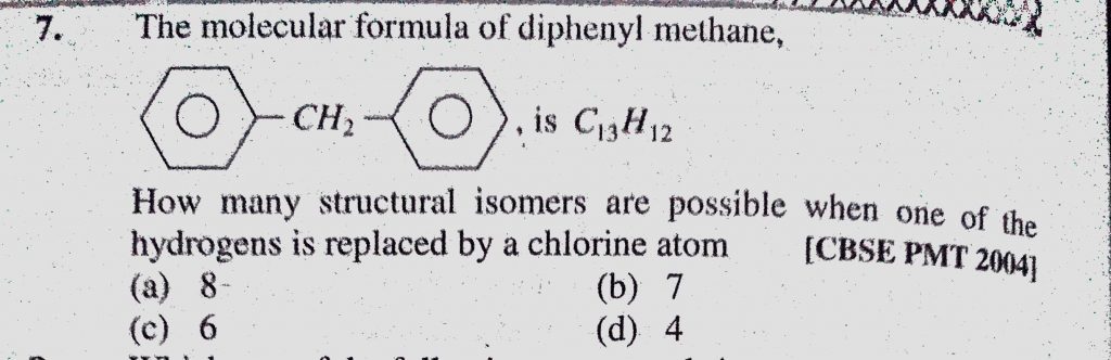 The molecular formula of diphenyl methane, How many structural isomers are possible when one of the hydrogens is replaced by a chlorine atom How many structural isomers are possible when one of the hydrogens is replaced by a chlorine atom The molecular formula of diphenyl methane December 11, 2020 Category: Uncategorised (JEE Advanced Physics by BM Sharma + GMP Solutions) , Facebook Messenger WhatsApp Share this:TwitterFacebook Related