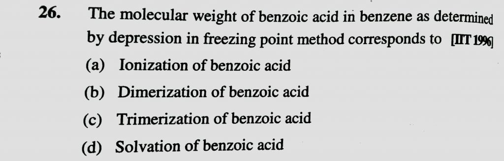 The molecular weight of benozoic acid a in benzene as determined by depression in freezing point method corresponds to The molecular weight of benozoic acid a in benzene as determined by depression in freezing point method corresponds to December 14, 2020 Category: Uncategorised (JEE Advanced Physics by BM Sharma + GMP Solutions) , Facebook Messenger WhatsApp Share this:TwitterFacebook Related