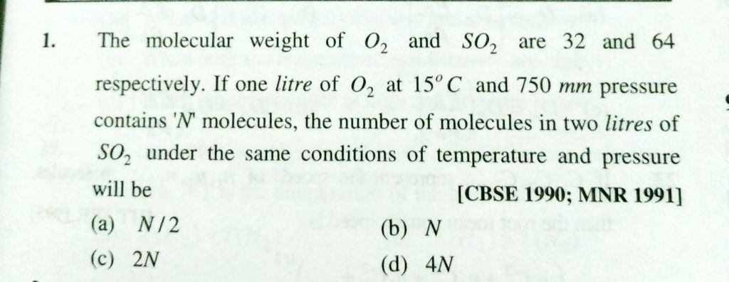 The molecular weight of O 2 and SO 2 are 32 and 64, respectively. If one litre of O2 at 15 degree C and 750 mm pressure contain ‘N’ molecule, the number of molecules in two litres of SO2 under the same conditions of temperature and pressure will be: