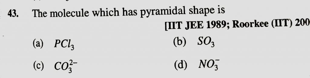 The molecule which has pyramidal shape is (a) PCL3 (b) SO3 9c) CO3^2- (d) NO3^- The molecule which has pyramidal shape is (a) PCL3 (b) SO3 9c) CO3^2- (d) NO3^- December 9, 2020 Category: Uncategorised (JEE Advanced Physics by BM Sharma + GMP Solutions) , Facebook Messenger WhatsApp Share this:TwitterFacebook Related