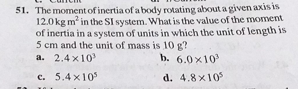 The moment of inertia of a body rotating about a given axis is 12.0 kgm^2 in the SI system. What is the value of the moment of inertia in a system of units in which the unit of length is 5 cm The moment of inertia of a body rotating about a given axis is 12.0 kgm^2 in the SI system. What is the value of the moment of inertia in a system of units in which the unit of length is 5 cm September 15, 2020 Category: Uncategorised (JEE Advanced Physics by BM Sharma + GMP Solutions) , Facebook Messenger WhatsApp Share this:TwitterFacebook Related