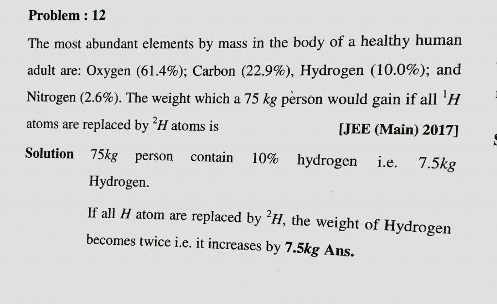 The most abundant elements by mass in the body of a helathy human adult are ; oxygen (61.4% ) ; carbon (22.9 % ) , hydrogen (10.0 %) ; and Nitrogen (2.6 % ). The weight which a 75 kg [person would gain if all 1H atoms are replaced by 2H atoms is hydrogen (10.0 %) ; and Nitrogen (2.6 % ). The weight which a 75 kg [person would gain if all 1H atoms are replaced by 2H atoms is The most abundant elements by mass in the body of a helathy human adult are ; oxygen (61.4% ) ; carbon (22.9 % ) November 25, 2020 Category: Uncategorised (JEE Advanced Physics by BM Sharma + GMP Solutions) , Facebook Messenger WhatsApp Share this:TwitterFacebook Related