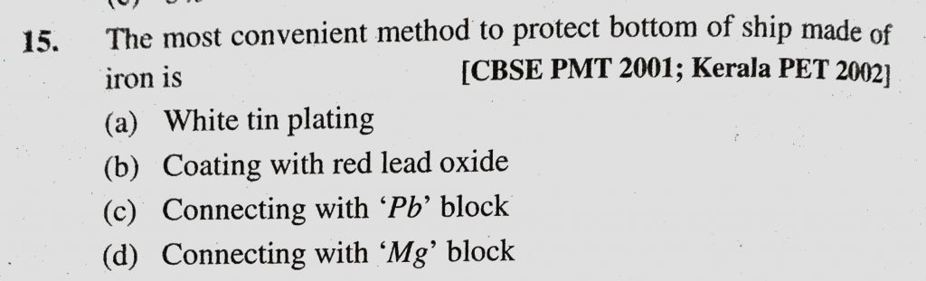 The most convenient method to protect bottom of ship made of iron is (a) White tin plating (b) Coating with red lead oxide The most convenient method to protect bottom of ship made of iron is (a) White tin plating (b) Coating with red lead oxide December 1, 2020 Category: Uncategorised (JEE Advanced Physics by BM Sharma + GMP Solutions) , Facebook Messenger WhatsApp Share this:TwitterFacebook Related