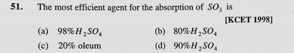 The most efficient agent for the absorption of SO3 is (a) 98% H2SO4 (b) 80% H2SO4 (c) 20% oleum (d) 90% H2SO4 The most efficient agent for the absorption of SO3 is (a) 98% H2SO4 (b) 80% H2SO4 (c) 20% oleum (d) 90% H2SO4 November 27, 2020 Category: Uncategorised (JEE Advanced Physics by BM Sharma + GMP Solutions) , Facebook Messenger WhatsApp Share this:TwitterFacebook Related