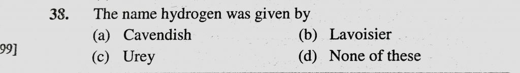 The name hydrogen was given by (a) Cavendish (b) Lavoisier (c) Urey (d) None of these The name hydrogen was given by (a) Cavendish (b) Lavoisier (c) Urey (d) None of these November 13, 2020 Category: Uncategorised (JEE Advanced Physics by BM Sharma + GMP Solutions) , Facebook Messenger WhatsApp Share this:TwitterFacebook Related