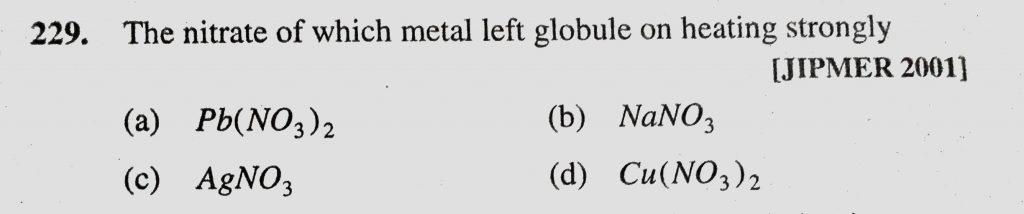 The nitrate of which metal left globule on heating strongly (a) Pb(NO3)2 (b) NaNO3 (c) AgNO3 (d) Cu(NO3)2 The nitrate of which metal left globule on heating strongly (a) Pb(NO3)2 (b) NaNO3 (c) AgNO3 (d) Cu(NO3)2 December 2, 2020 Category: Uncategorised (JEE Advanced Physics by BM Sharma + GMP Solutions) , Facebook Messenger WhatsApp Share this:TwitterFacebook Related