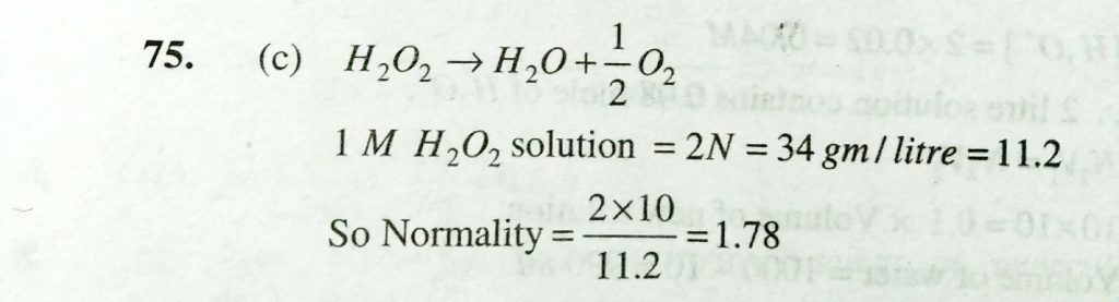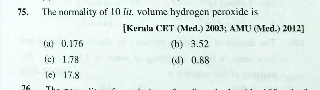 The normality of 10 lit. volume hydrogen peroxide is (a) 0.176 (b) 3.52 (c) 1.78 (d) 0.88 (e) 17.8 The normality of 10 lit. volume hydrogen peroxide is (a) 0.176 (b) 3.52 (c) 1.78 (d) 0.88 (e) 17.8 December 11, 2020 Category: Uncategorised (JEE Advanced Physics by BM Sharma + GMP Solutions) , Facebook Messenger WhatsApp Share this:TwitterFacebook Related