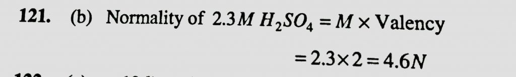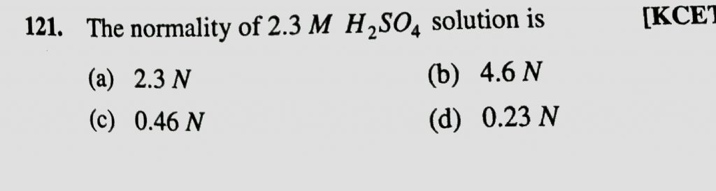 The normality of 2.3 M H2SO4 solution is (a) 2.3 N (b) 4.6 N (c) 0.46 N (d) 0.23 N The normality of 2.3 M H2SO4 solution is (a) 2.3 N (b) 4.6 N (c) 0.46 N (d) 0.23 N December 12, 2020 Category: Uncategorised (JEE Advanced Physics by BM Sharma + GMP Solutions) , Facebook Messenger WhatsApp Share this:TwitterFacebook Related