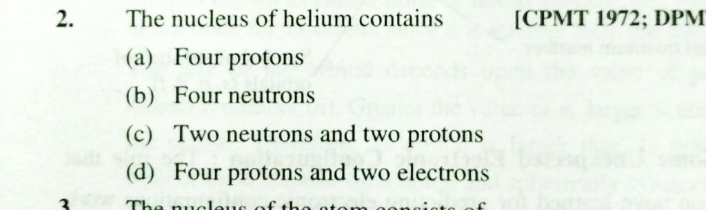 The nucleus of helium contains (a) Four protons (b) Four neutrons (c) Two neutrons and two protons (d) four protons and two electrons The nucleus of helium contains (a) Four protons (b) Four neutrons (c) Two neutrons and two protons (d) four protons and two electrons November 26, 2020 Category: Uncategorised (JEE Advanced Physics by BM Sharma + GMP Solutions) , Facebook Messenger WhatsApp Share this:TwitterFacebook Related