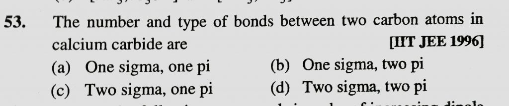 The number and type of bonds between two carbon atoms in calcium carbide are The number and type of bonds between two carbon atoms in calcium carbide are December 9, 2020 Category: Uncategorised (JEE Advanced Physics by BM Sharma + GMP Solutions) , Facebook Messenger WhatsApp Share this:TwitterFacebook Related