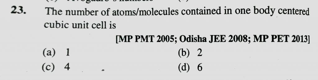 The number of atoms /molecules contained in one body centered cubic unit cell is (a) 1 (b) 2 (c) 4 (d) 6 The number of atoms /molecules contained in one body centered cubic unit cell is (a) 1 (b) 2 (c) 4 (d) 6 December 17, 2020 Category: Uncategorised (JEE Advanced Physics by BM Sharma + GMP Solutions) , Facebook Messenger WhatsApp Share this:TwitterFacebook Related