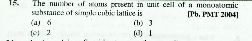 The number of atoms present in unit cell of a monoatomic substance of simple cubic lattice is (a) 6 (b) 3 (c) 2 (d) 1 The number of atoms present in unit cell of a monoatomic substance of simple cubic lattice is (a) 6 (b) 3 (c) 2 (d) 1 February 9, 2021 Category: Uncategorised (JEE Advanced Physics by BM Sharma + GMP Solutions) , Facebook Messenger WhatsApp Share this:TwitterFacebook Related