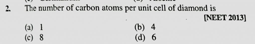 The number of carbon atoms per unit cell of diamond is (a) 1 (b) 4 (c) 8 (d) 6 The number of carbon atoms per unit cell of diamond is (a) 1 (b) 4 (c) 8 (d) 6 February 8, 2021 Category: Uncategorised (JEE Advanced Physics by BM Sharma + GMP Solutions) , Facebook Messenger WhatsApp Share this:TwitterFacebook Related