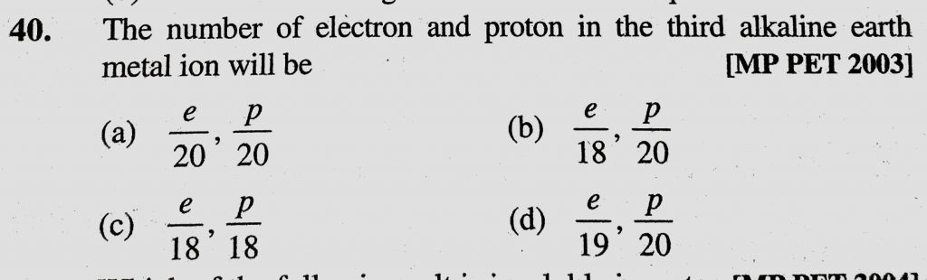 The number of electron and proton in the third alkaline earth metal ion will be (a) e/20, p/20 (b) e/18, p/20 p/20 p/20 (b) e/18 The number of electron and proton in the third alkaline earth metal ion will be (a) e/20 November 27, 2020 Category: Uncategorised (JEE Advanced Physics by BM Sharma + GMP Solutions) , Facebook Messenger WhatsApp Share this:TwitterFacebook Related