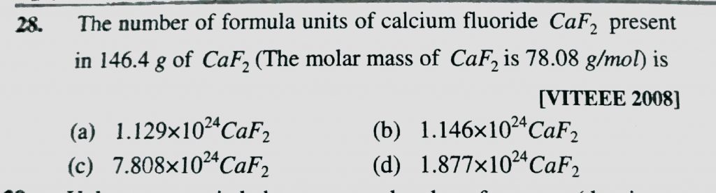 THe number of formula units of calcium fluoride CaF2 present in 146.4 g of CaF2 (the molar mass of CaF2 is 78.08 g/mol ) is THe number of formula units of calcium fluoride CaF2 present in 146.4 g of CaF2 (the molar mass of CaF2 is 78.08 g/mol ) is November 22, 2020 Category: Uncategorised (JEE Advanced Physics by BM Sharma + GMP Solutions) , Facebook Messenger WhatsApp Share this:TwitterFacebook Related