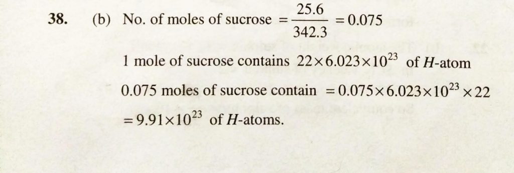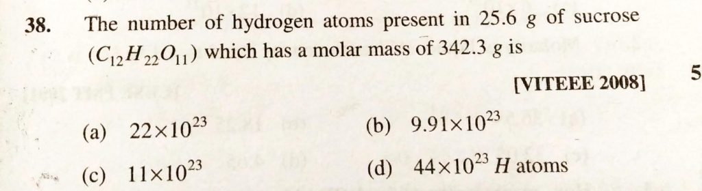The number of hydrogen atoms present in 25.6 g of sucrose (C12 H22 O11 ) which has a molar mass of 342.3 g is The number of hydrogen atoms present in 25.6 g of sucrose (C12 H22 O11 ) which has a molar mass of 342.3 g is November 22, 2020 Category: Uncategorised (JEE Advanced Physics by BM Sharma + GMP Solutions) , Facebook Messenger WhatsApp Share this:TwitterFacebook Related